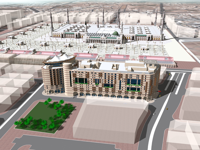 After the great success attained by Munshaat in Makkah Al-Mukarramah, it commenced its investments in Al-Madina Al-Munawwarah, The City ofthe Prophet (PBUH), the second islamic Capital after Makkah Al-Mukarramah. Investment was directed to Al-Madina Al-Munawwarah because of the ongoing increase in the prices of hotels and the increasing demand there. lt is noted that the visitors of Al-Madina Al-Murrawwarah increased in the last years. This is attributed to Allah's Help and the facilities offered by the Saudi Government to the visitors. Based on such, Munshaat signed an agreement with the Central Committee in Al-Madina Al-Munawwarah to invest the land of Dar Al-Qeblah Project for 25 Hijri years based on (B.O.T) system. The land of the Project is located in Al-Bany Khadra neighborhood at Ai-Madina Al-Munawwarah, some 150 meters away from the Prophet's Holy Mosque. The total land area of Al-Qeblah Project is 8173 sq. m, but the total construction area is more than 100000 sq.m. and consists of: