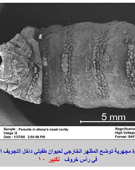 صورة مجهرية توضح المظهر الخارجي لحيوان طفيلي داخل التجويف الأنفي في رأس خروف |