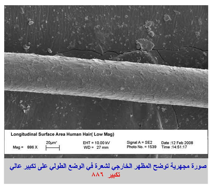 3 صورة مجهرية توضح المظهر الخارجي لشعرة انسان في الوضع الطولي تكبير 2150