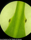 1 صورة مجهرية توضح المظهر السطحي لغدتين على جانبي ورقة نباتية في فصل الشتاء التقطت بالمجهر المجسم الرقمي